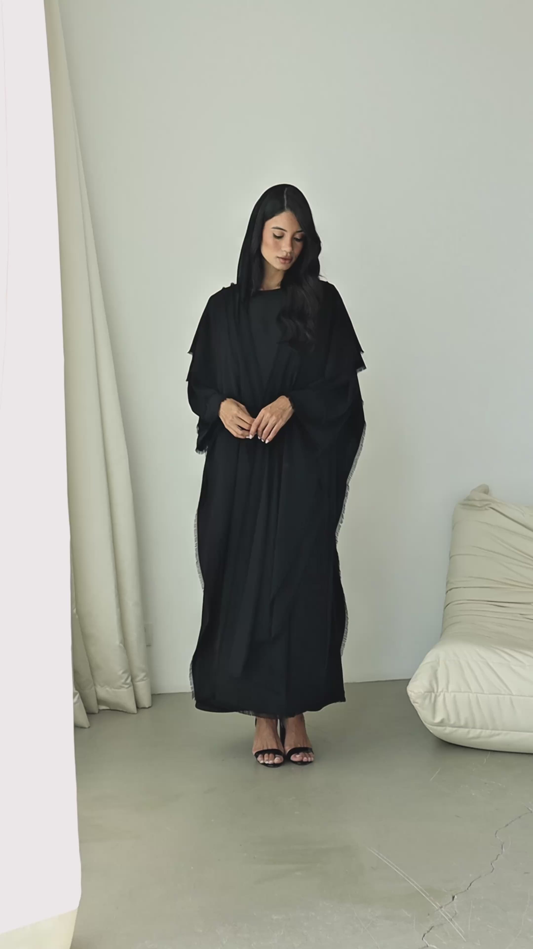 A black layered abaya accented with delicate fringe detailing for elegant movement and modern sophistication.