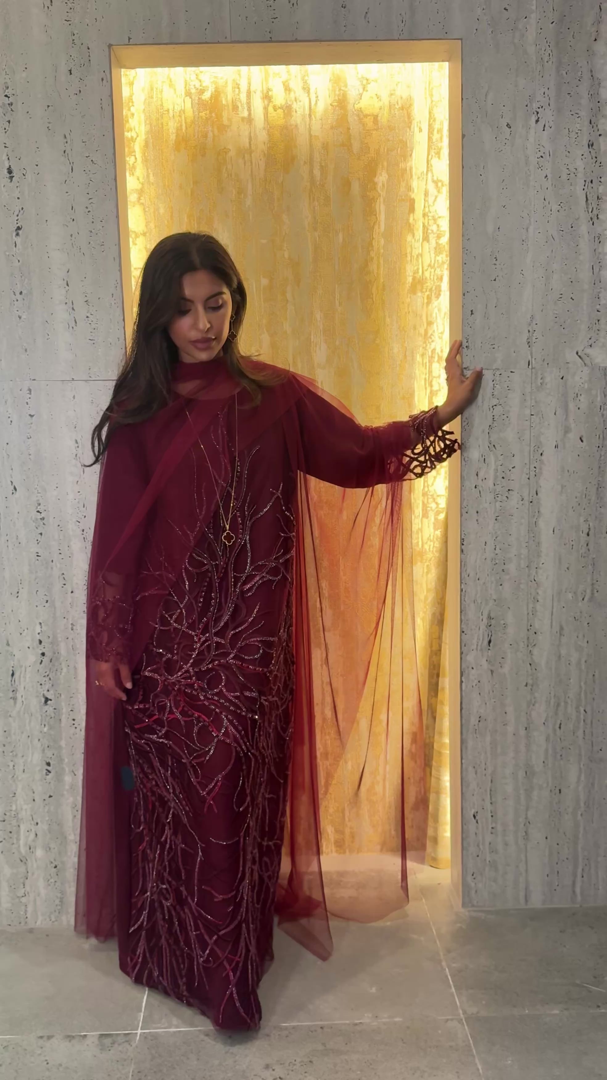 Make a statement with this maroon embellished dress, a true luxury piece for your modest wear collection. Crafted from sheer tule with intricate beadwork, it features a delicate overlay that adds elegance and sophistication. The rich maroon tone makes it perfect for evening events, weddings, and festive occasions. Flowing fabric and fine details ensure both comfort and grace, making this dress a must-have for women who love timeless elegance with a touch of glamour.