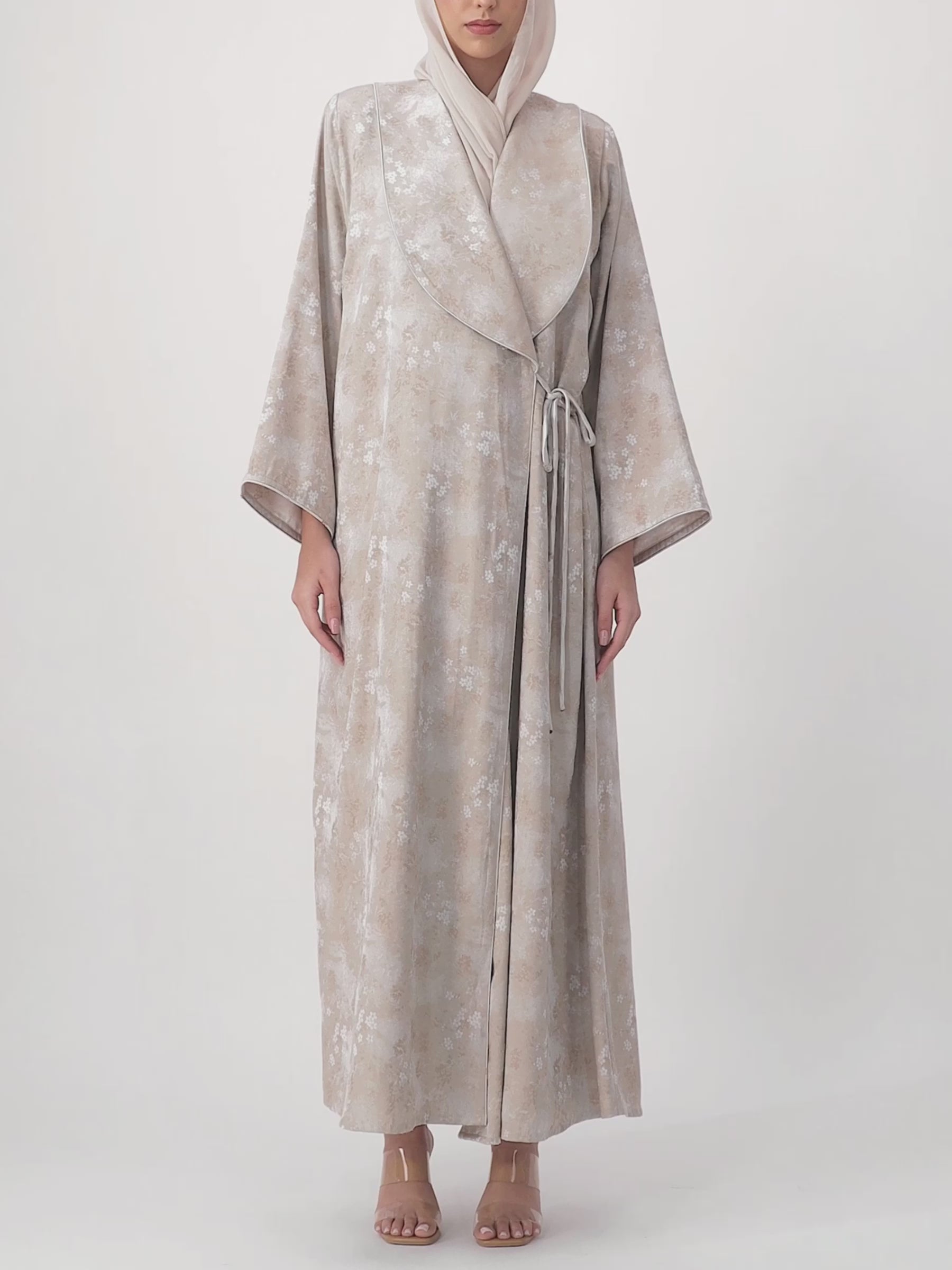 Crafted from premium Jacquard, the Desert Bloom Abaya features soft beige hues with delicate floral prints inspired by desert landscapes. Designed with a refined collar and adjustable waist tie, it offers a structured yet feminine silhouette. The lightweight, flowy fabric drapes beautifully with a subtle sheen, creating a graceful balance of comfort and sophistication—perfect for daytime elegance and semi-formal occasions.