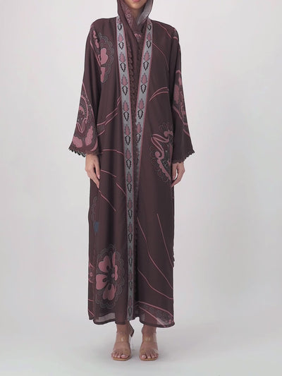 Graceful and refined, this deep maroon abaya is crafted from exclusive printed fabric featuring elegant floral motifs in soft pink tones. Delicate lace detailing adorns the front edges and sleeves, adding a touch of femininity and sophistication. Perfect for elevating any occasion, this abaya blends modern artistry with timeless elegance.