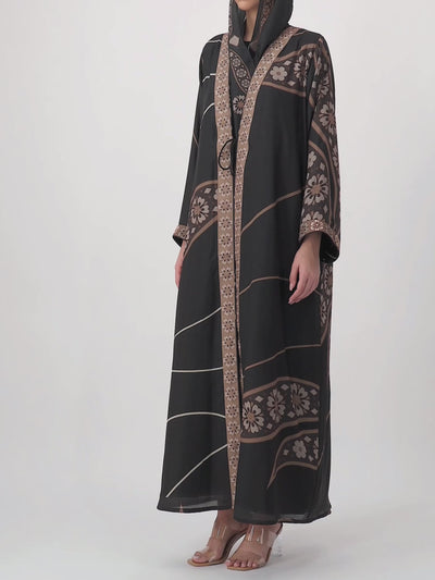 Experience refined elegance with this dark brown abaya, adorned with a delicate floral-embroidered ribbon along the front and cuffs. The flowing silhouette drapes beautifully, offering effortless sophistication and comfort. Soft beige and bronze embroidery add a touch of luxury, while the front tie detail enhances its contemporary charm. Perfect for both day and evening wear, this abaya captures the essence of timeless grace and modern refinement.