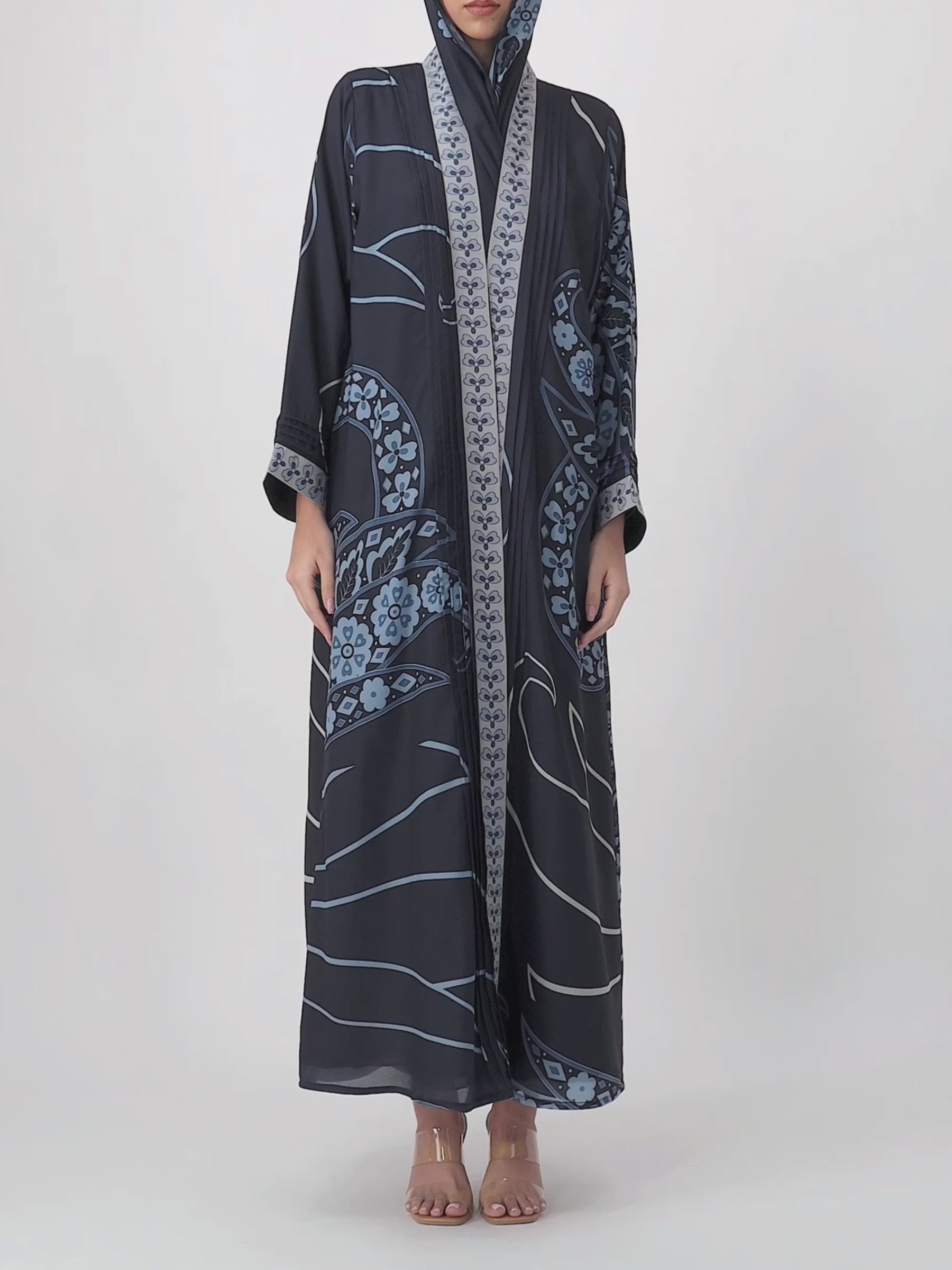 Elegant and timeless, the Dusk Petals Abaya features a deep navy hue adorned with exclusive blue floral prints. The front panel and cuffs are highlighted with intricate embroidered detailing, adding depth and sophistication. Crafted from premium lightweight fabric, this abaya drapes beautifully, offering a refined blend of modern grace and classic charm.