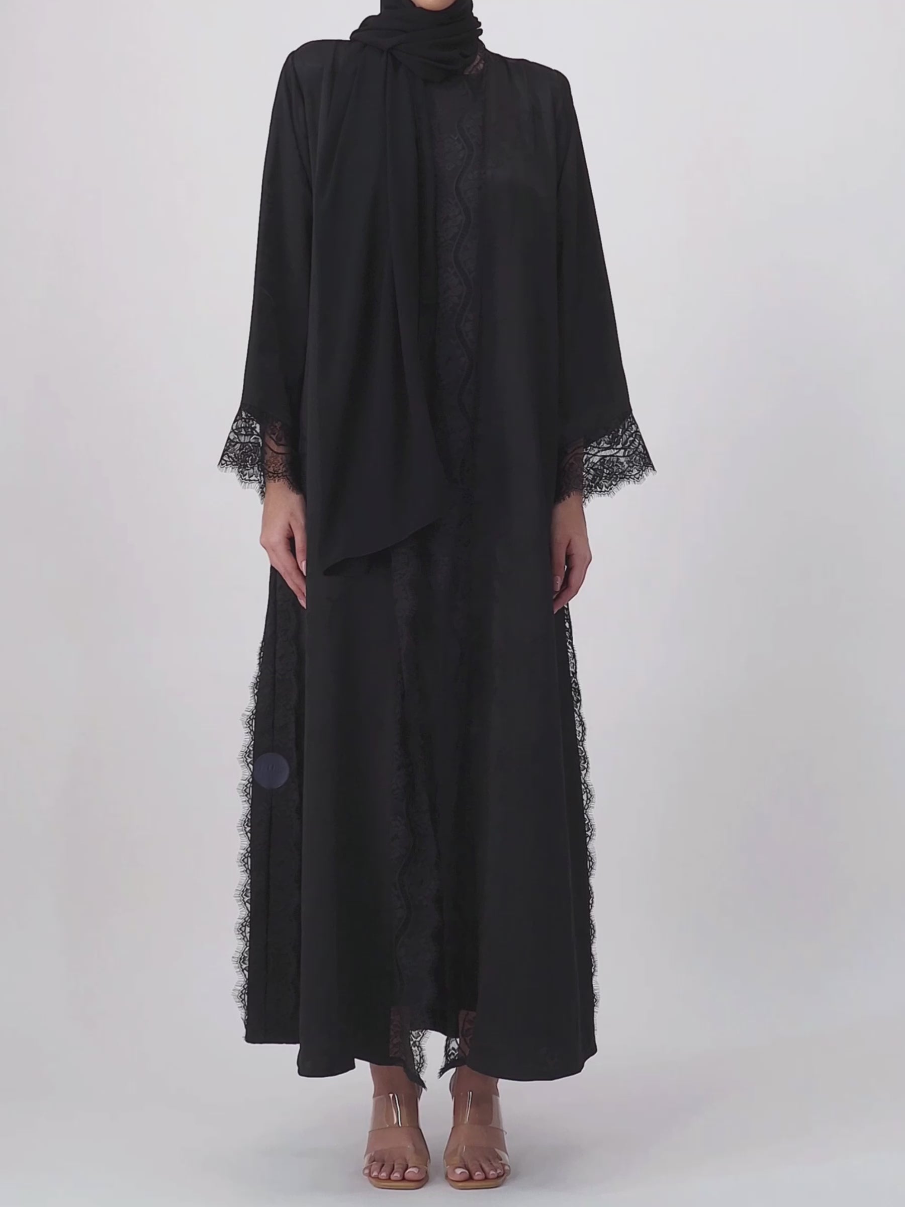 This elegant black jacquard abaya is designed with delicate lace detailing along the front opening and cuffs, enhancing its classic appeal. The soft, silky jacquard fabric features a tonal floral weave that catches light beautifully. Lightweight yet luxurious, this abaya offers elegance and comfort for special occasions, making it an ideal choice for those who appreciate refined craftsmanship and timeless modest fashion.