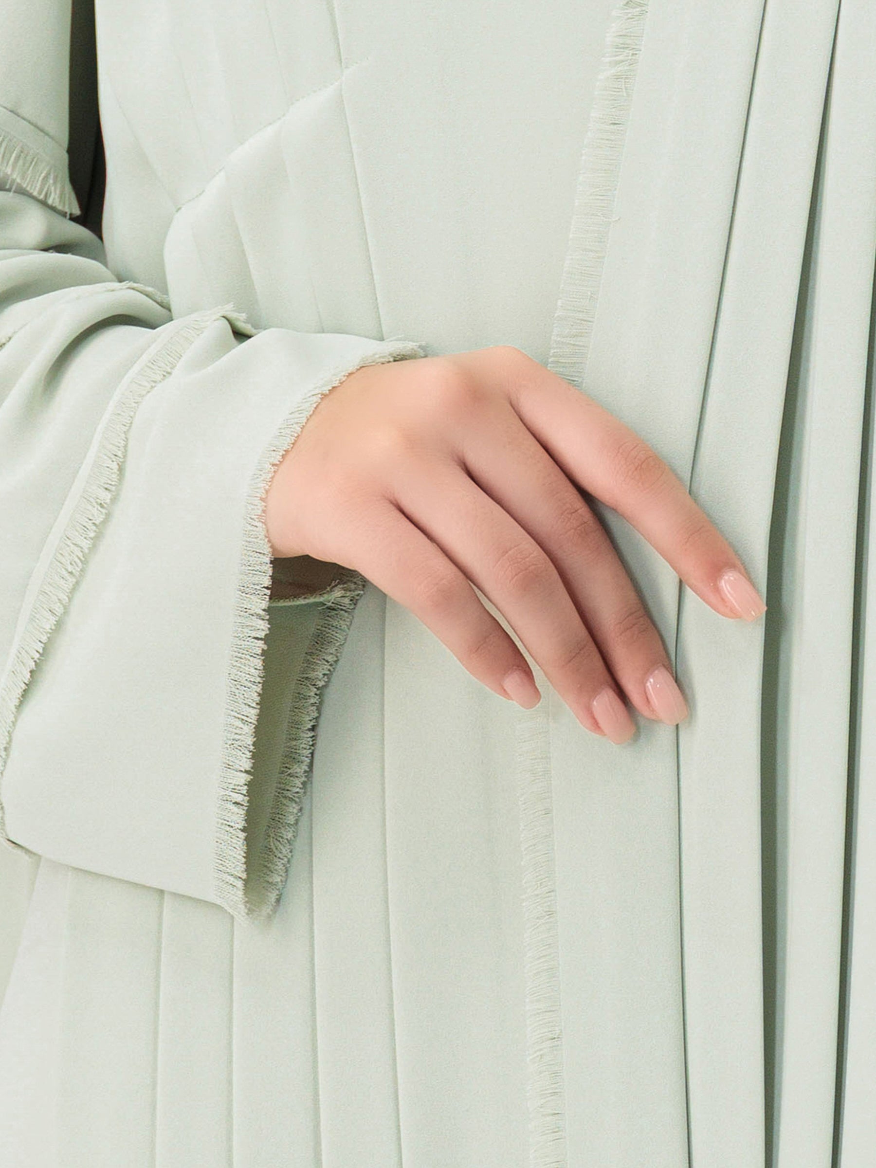 Refresh your modest wardrobe with the Green Pleated Crepe Abaya. Featuring delicate pleating along the front and fringe detailing on sleeves, this soft crepe design flows beautifully for a graceful finish. The light pastel green shade brings a fresh, serene vibe, perfect for spring and summer occasions.