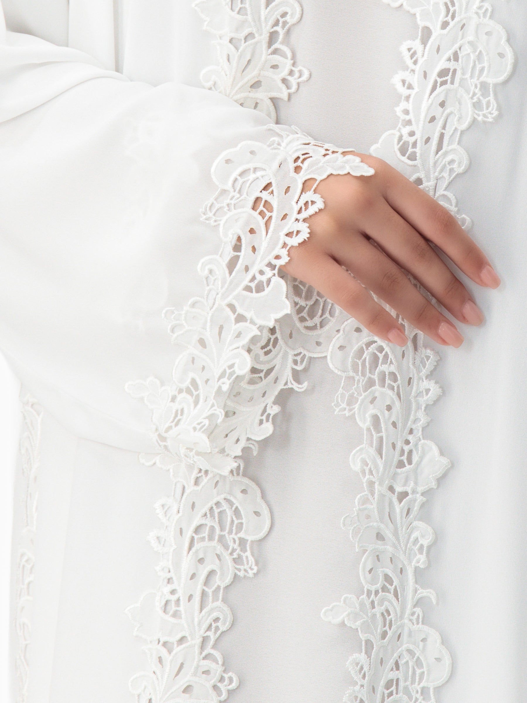 The Majesty abaya set is crafted from light crepe fabric in pure white, detailed with vertical floral lace on front and sleeves that adds texture and elegance. It also comes with a matching dress with lace detail on neck to complete the look. Its breathable fabric keeps it comfortable throughout the day, while the timeless white shade makes it perfect for festive gatherings, religious occasions, or formal events. Complete with coordinating pieces, this set embodies purity and sophistication for women who appreciate modesty with refined craftsmanship.