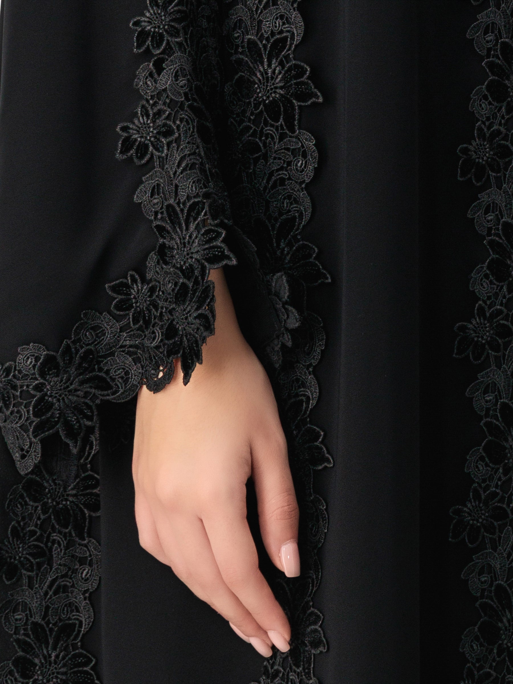 Crafted from flowing chiffon, this black abaya is adorned with floral lace detailing along the front, back and sleeves. This abaya is designed with side slits for comfort and chic look. Its timeless colour combined with delicate lace creates a versatile piece suitable for formal evenings, festive gatherings, or daily elegance. The fabric drapes beautifully, offering modesty and comfort. A classic choice for women who value graceful details in a refined black silhouette.