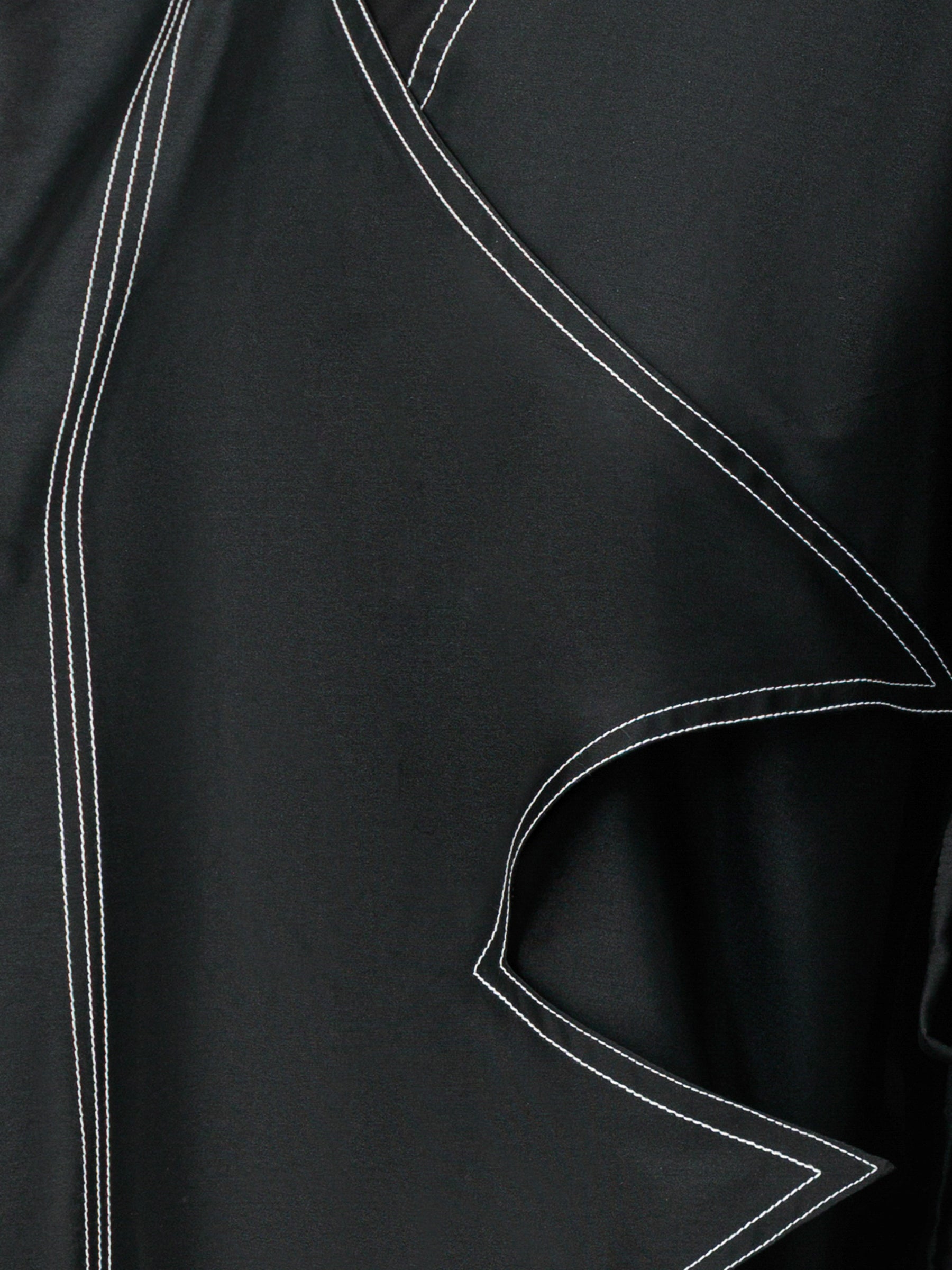 Step out in style with the Taffeta Zigzag Abaya, crafted from luxurious black taffeta fabric that gives a sleek and structured finish. The design features contrasting zigzag stitch detailing along the front, adding a modern geometric touch to the classic silhouette. With its wide sleeves and clean cut, this abaya offers a bold yet elegant look perfect for special occasions or contemporary everyday wear.