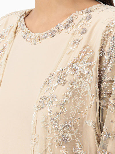 The Sahra dress radiates classic elegance with its beige crepe base, enriched by golden floral embroidery. The soft sheer overlay provides a graceful drape, while the modest fit ensures both comfort and sophistication. Perfect for traditional events or formal evenings, the golden detailing adds a hint of luxury without being overpowering. This dress is a timeless wardrobe addition for effortless charm and poise.