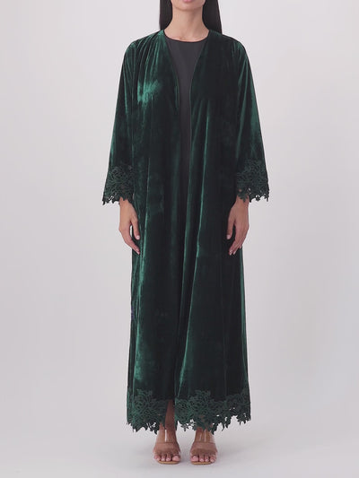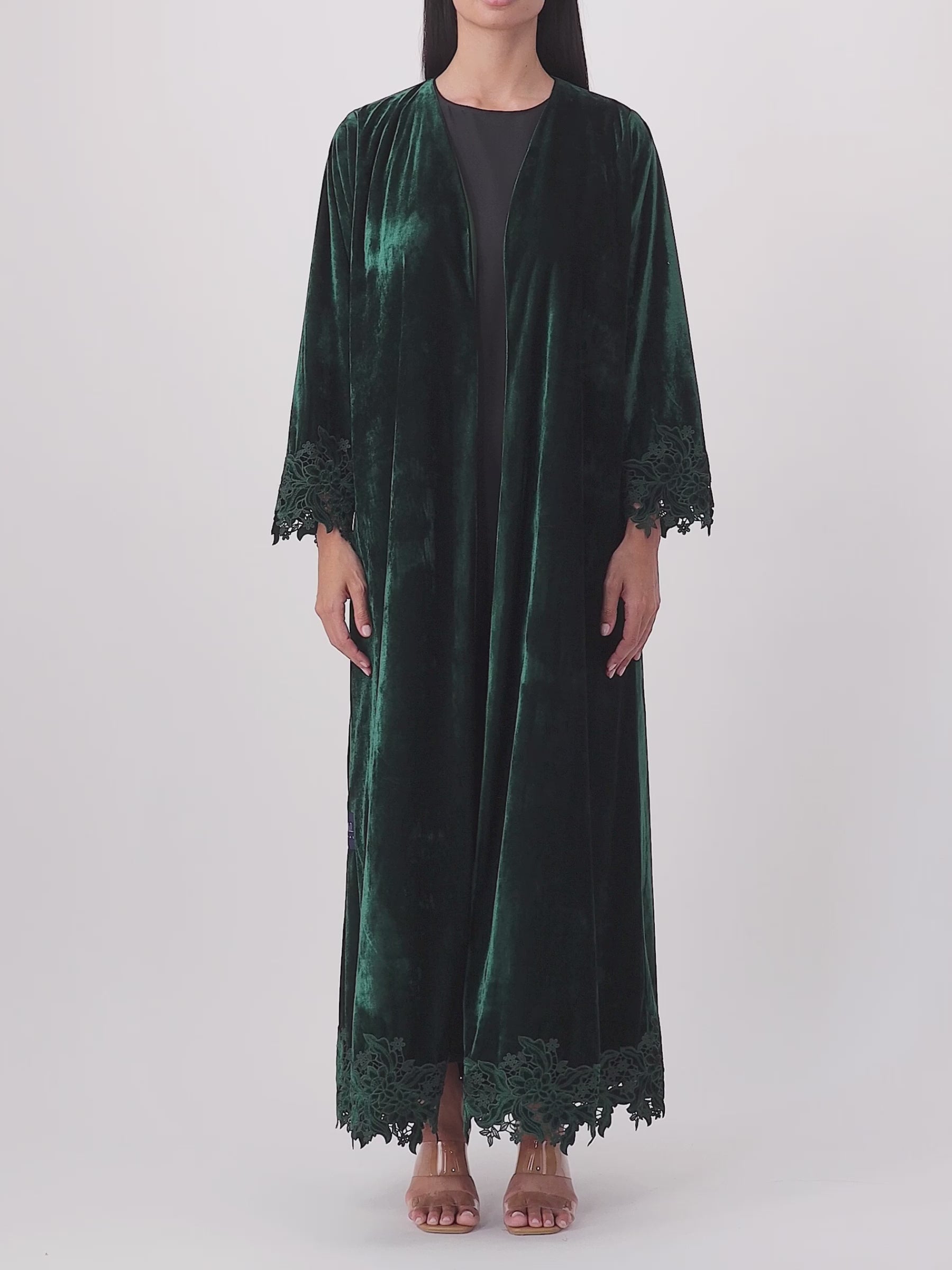 Tailored from rich velvet fabric, this abaya embodies refined simplicity and graceful flow.