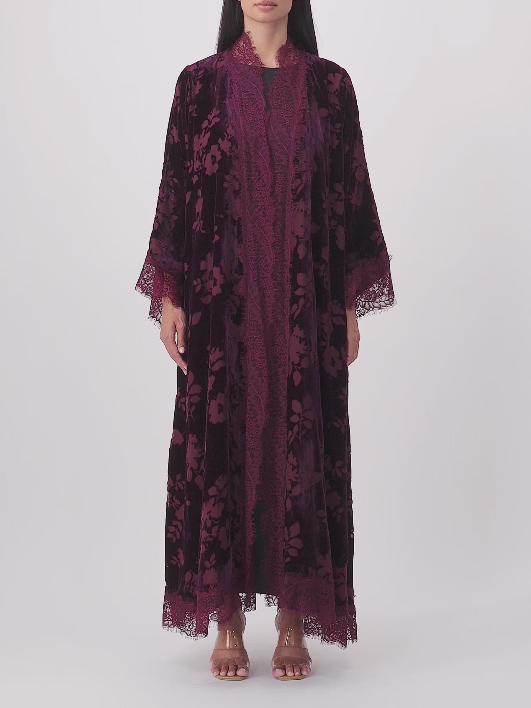 Tailored from rich velvet fabric, this abaya embodies refined simplicity and graceful flow.