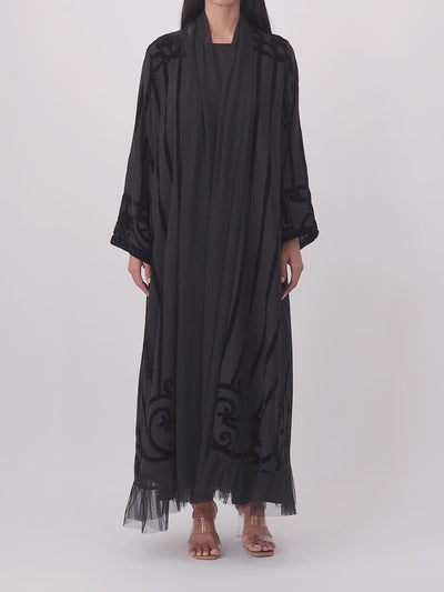 Tailored from rich velvet fabric, this abaya embodies refined simplicity and graceful flow.